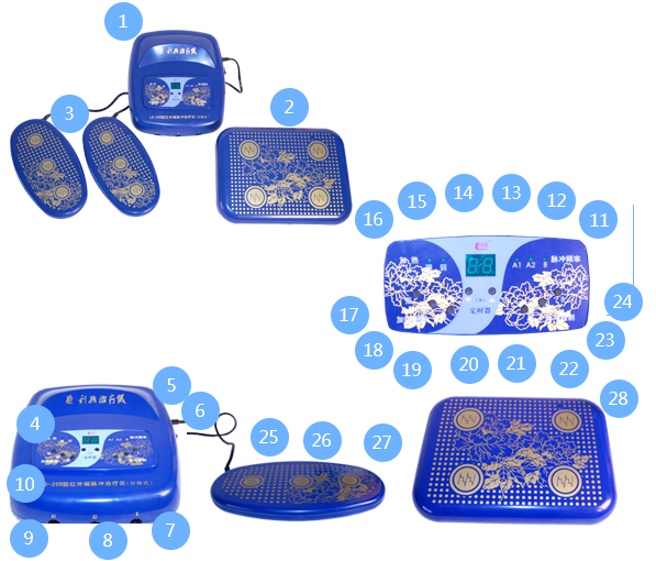 1、主機(jī)?2、四點(diǎn)式治療體(LDA-2型)3、三點(diǎn)式治療體(LDA-1型)4、面板貼膜 5、電源線6、電源開(kāi)關(guān)7、B輸出插座8、A2輸出插座9、A1輸出插座?10、加熱輸出實(shí)時(shí)指示燈11、B脈沖頻率指示燈?12、A2脈沖頻率指示燈?13、A1脈沖頻率指示燈?14、定時(shí)顯示?15、弱加熱指示燈?16、強(qiáng)加熱指示燈?17、強(qiáng)加熱設(shè)置鍵? ?18、弱加熱設(shè)置鍵?19、關(guān)加熱鍵?20、定時(shí)設(shè)置降序鍵?21、定時(shí)設(shè)置升序鍵?22、關(guān)脈沖鍵? ?23、A組脈沖頻率設(shè)置鍵? ?24、B組脈沖頻率設(shè)置鍵?25、治療面紅外涂層?26、標(biāo)記?27、連接線?28、脈沖頻率適用范圍